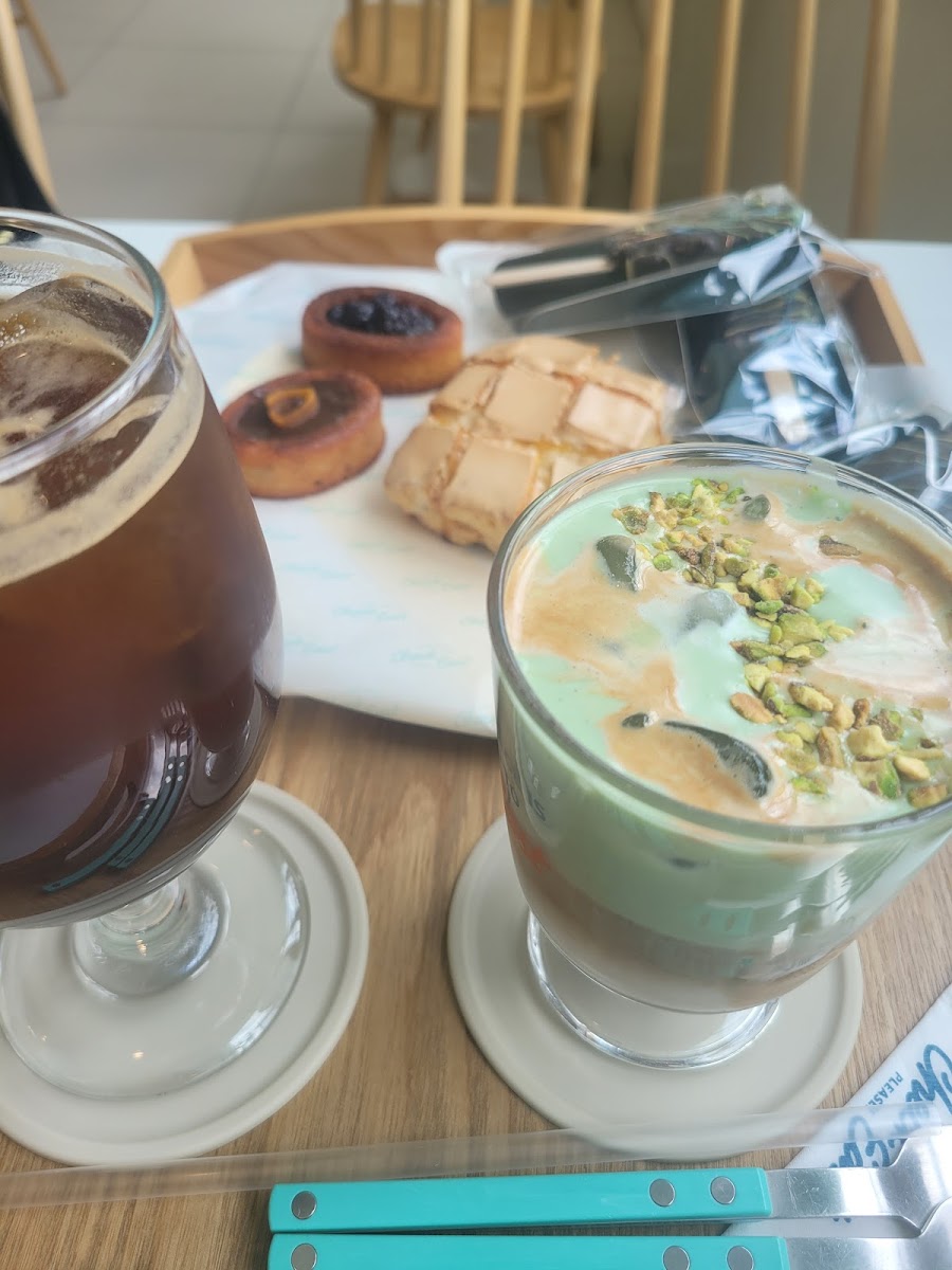 The menu offers a wide selection of drinks and pastries, with standout items that should not be missed. Indulge in the rich and aromatic Pistachio Cream Latte, where the creamy texture is perfectly balanced with the nutty undertones of pistachio. Each sip is a moment of indulgence, erupting into a flavorful embrace that leaves you craving more. Pair it with the famously sweet and crunchy Pistachio Queen Amang, which takes textures to new heights; the flaky pastry is artfully dipped in chocolate and dusted with pistachio, providing an unforgettable treat that continues to garner rave reviews.